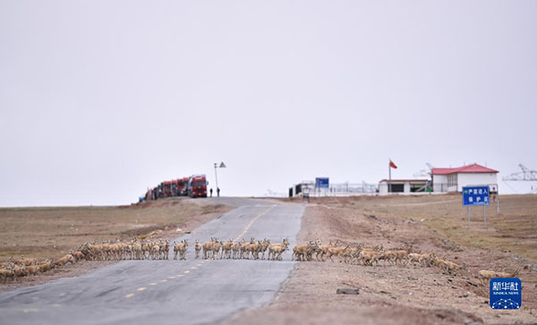 在青??煽晌骼铮蝗捍菩源a(chǎn)藏羚羊正在通過青藏公路(2016年6月7日攝)。新華社記者 吳剛 攝