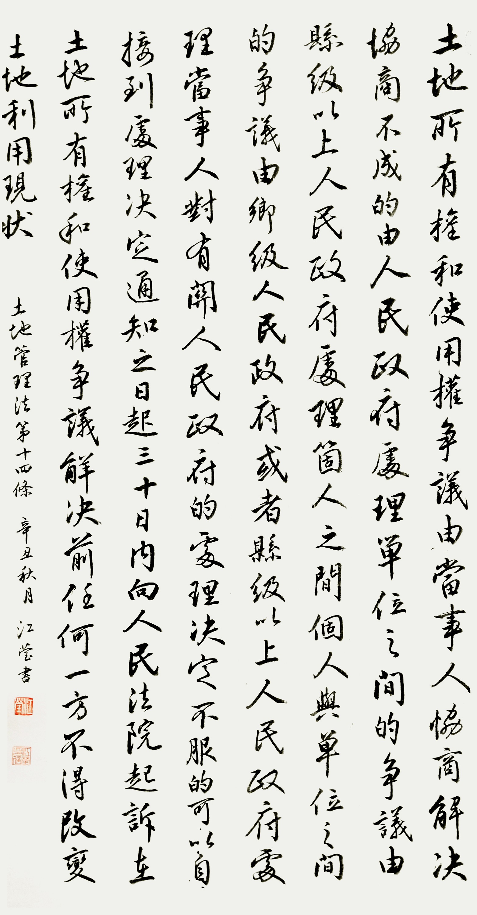 繼1600余位書法家參與書寫《中華人民共和國(guó)民法典》全部1260條法條之后,法治日?qǐng)?bào)社聯(lián)合自然資源部法規(guī)司、自然資源部書畫研究會(huì)和北京昌平書法家協(xié)會(huì),將筆端對(duì)準(zhǔn)土地管理“一法一條例”,即《中華人民共和國(guó)土地管理法》和《中華人民共和國(guó)土地管理法實(shí)施條例》。