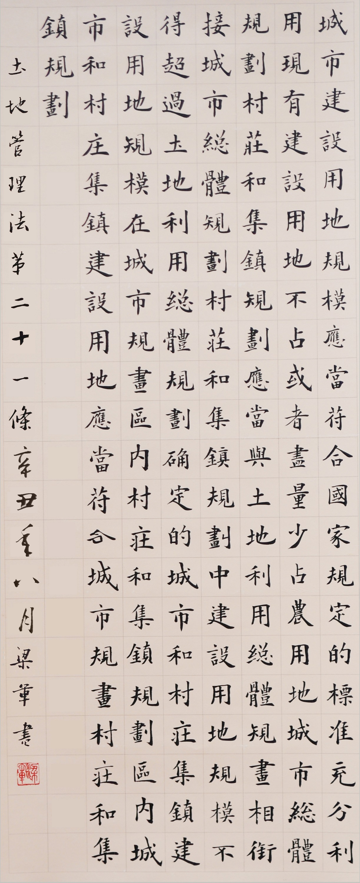繼1600余位書法家參與書寫《中華人民共和國民法典》全部1260條法條之后,法治日報社聯(lián)合自然資源部法規(guī)司、自然資源部書畫研究會和北京昌平書法家協(xié)會,將筆端對準土地管理“一法一條例”,即《中華人民共和國土地管理法》和《中華人民共和國土地管理法實施條例》。
