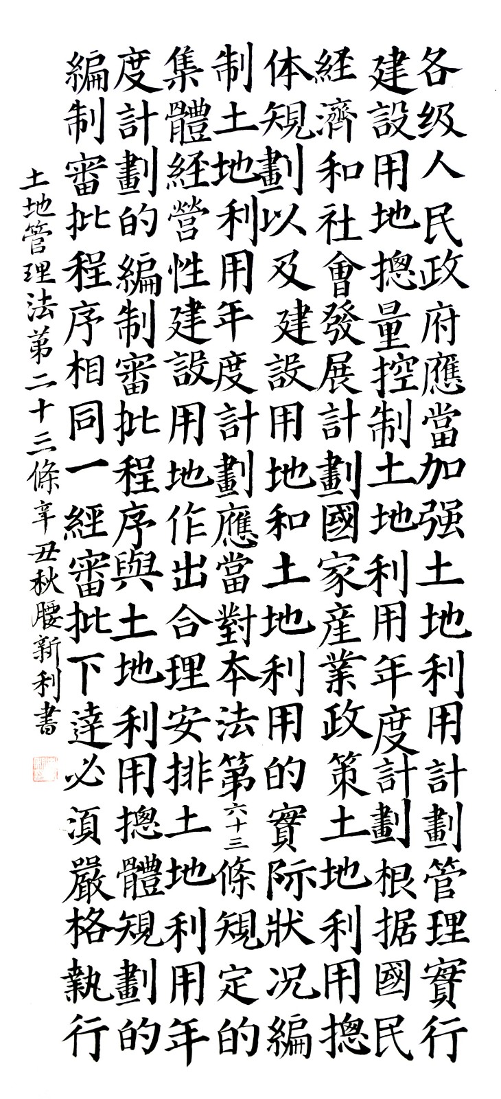 繼1600余位書法家參與書寫《中華人民共和國民法典》全部1260條法條之后,法治日報社聯(lián)合自然資源部法規(guī)司、自然資源部書畫研究會和北京昌平書法家協(xié)會,將筆端對準土地管理“一法一條例”,即《中華人民共和國土地管理法》和《中華人民共和國土地管理法實施條例》。