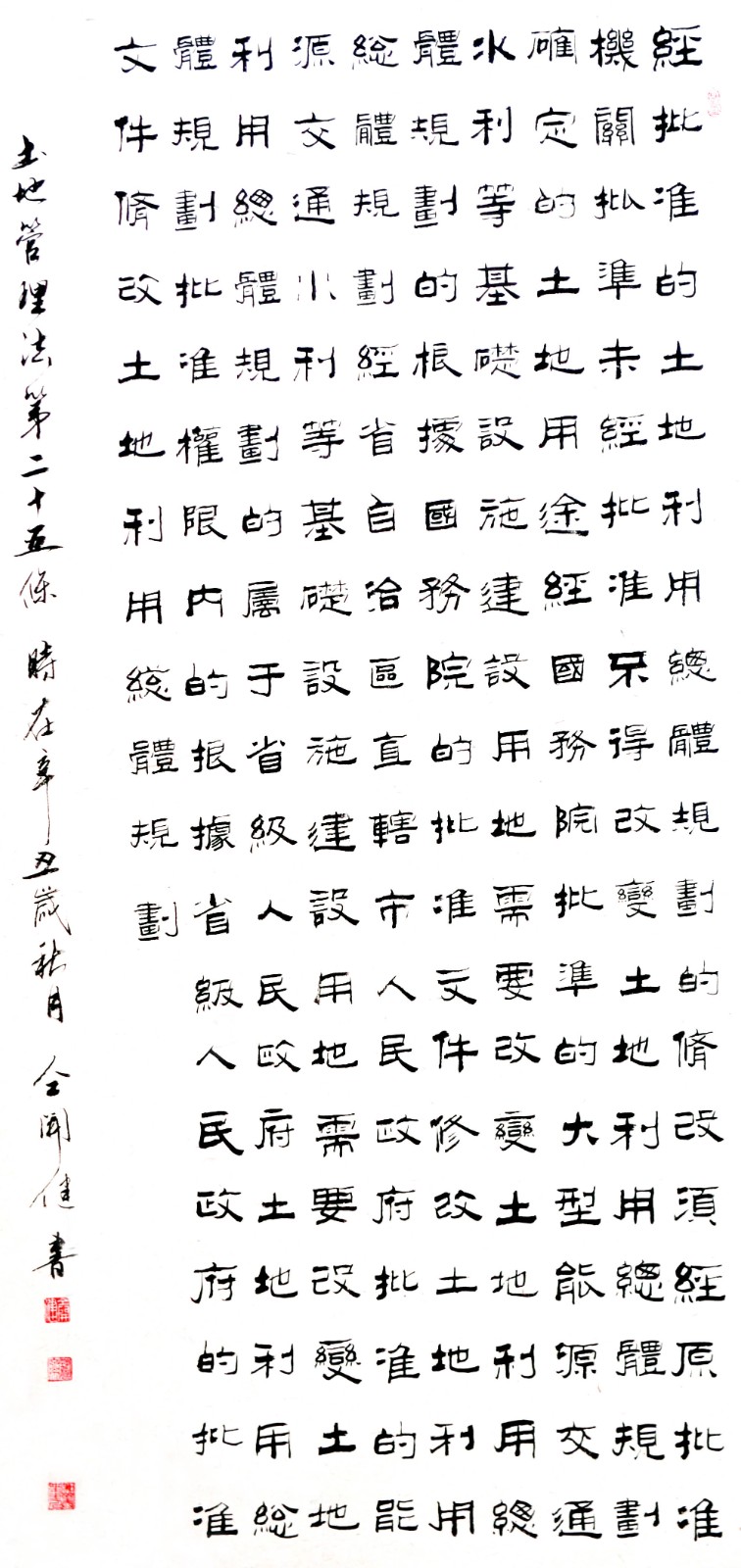 繼1600余位書法家參與書寫《中華人民共和國民法典》全部1260條法條之后,法治日報(bào)社聯(lián)合自然資源部法規(guī)司、自然資源部書畫研究會和北京昌平書法家協(xié)會,將筆端對準(zhǔn)土地管理“一法一條例”,即《中華人民共和國土地管理法》和《中華人民共和國土地管理法實(shí)施條例》。