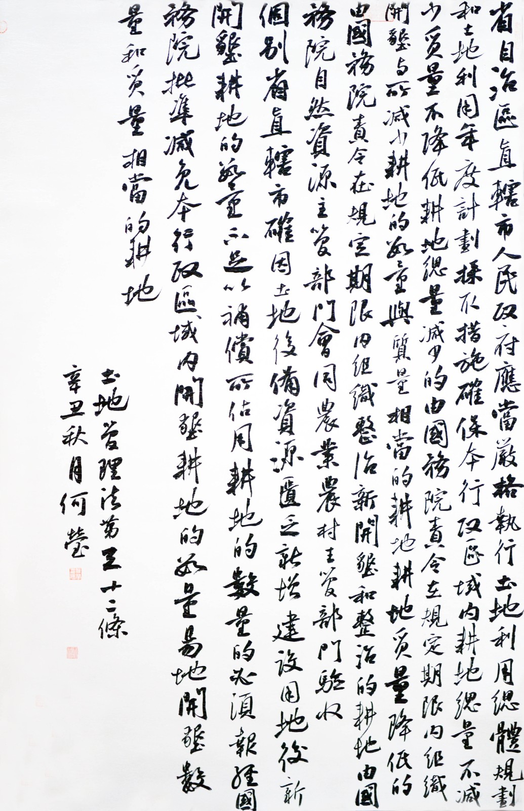 繼1600余位書(shū)法家參與書(shū)寫(xiě)《中華人民共和國(guó)民法典》全部1260條法條之后,法治日?qǐng)?bào)社聯(lián)合自然資源部法規(guī)司、自然資源部書(shū)畫(huà)研究會(huì)和北京昌平書(shū)法家協(xié)會(huì),將筆端對(duì)準(zhǔn)土地管理“一法一條例”,即《中華人民共和國(guó)土地管理法》和《中華人民共和國(guó)土地管理法實(shí)施條例》。