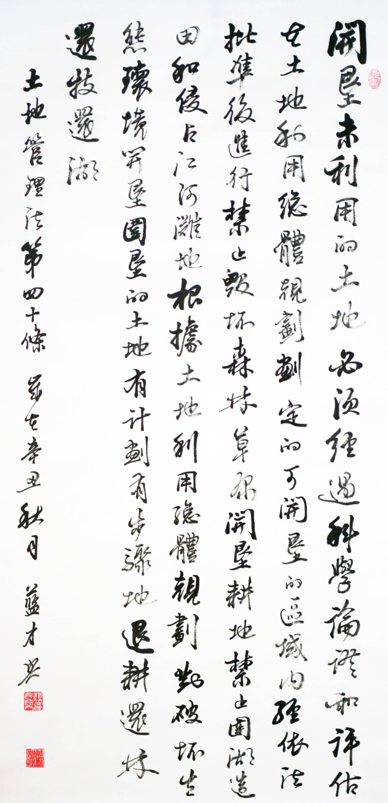 繼1600余位書法家參與書寫《中華人民共和國民法典》全部1260條法條之后,法治日報社聯(lián)合自然資源部法規(guī)司、自然資源部書畫研究會和北京昌平書法家協(xié)會,將筆端對準(zhǔn)土地管理“一法一條例”,即《中華人民共和國土地管理法》和《中華人民共和國土地管理法實施條例》。