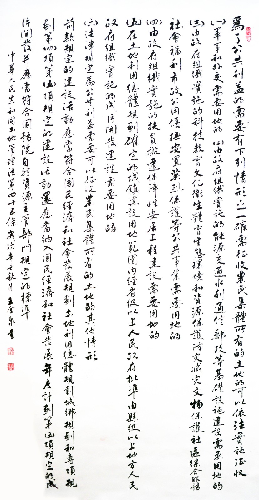繼1600余位書法家參與書寫《中華人民共和國民法典》全部1260條法條之后,法治日報社聯(lián)合自然資源部法規(guī)司、自然資源部書畫研究會和北京昌平書法家協(xié)會,將筆端對準土地管理“一法一條例”,即《中華人民共和國土地管理法》和《中華人民共和國土地管理法實施條例》。