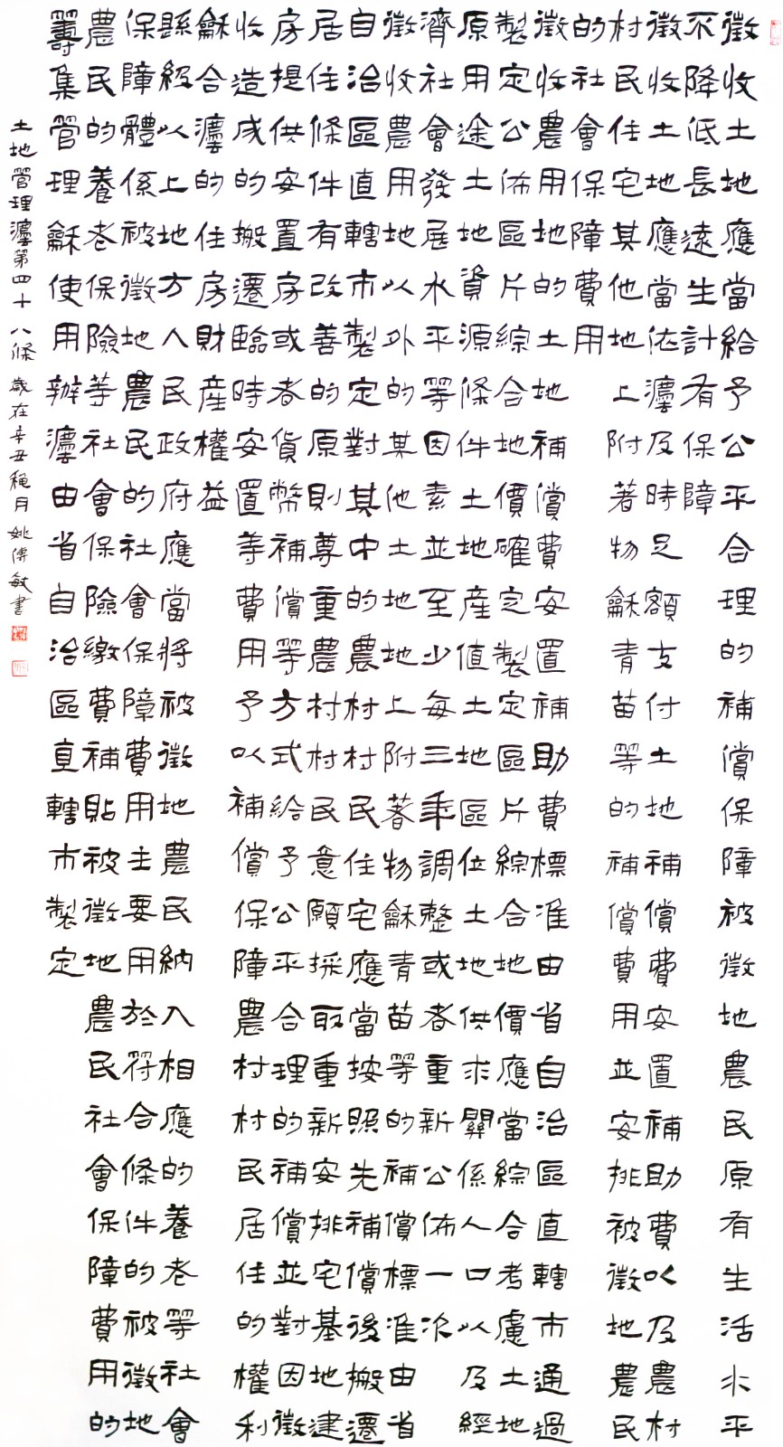 繼1600余位書法家參與書寫《中華人民共和國(guó)民法典》全部1260條法條之后,法治日?qǐng)?bào)社聯(lián)合自然資源部法規(guī)司、自然資源部書畫研究會(huì)和北京昌平書法家協(xié)會(huì),將筆端對(duì)準(zhǔn)土地管理“一法一條例”,即《中華人民共和國(guó)土地管理法》和《中華人民共和國(guó)土地管理法實(shí)施條例》。