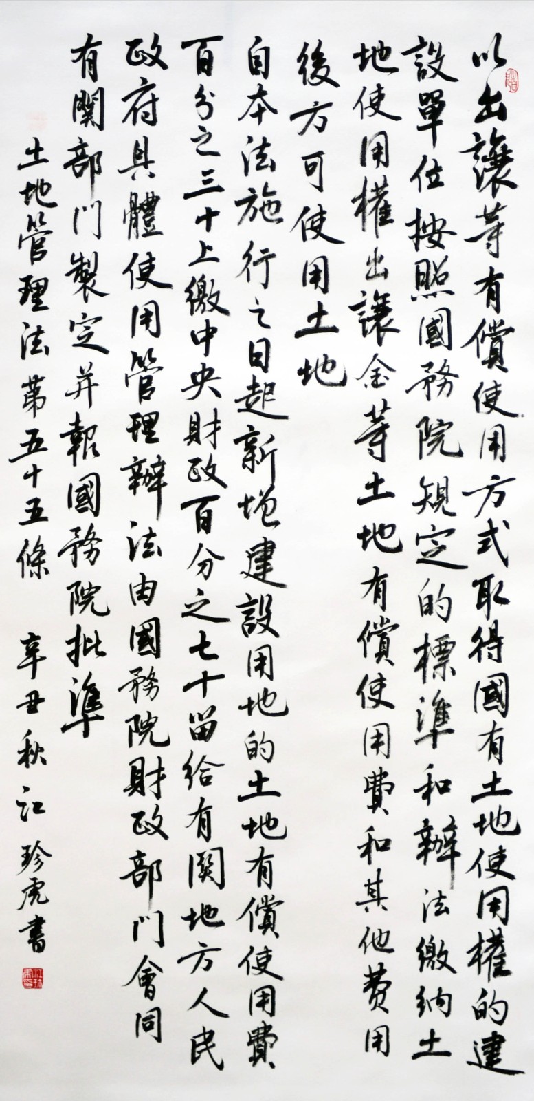 繼1600余位書(shū)法家參與書(shū)寫(xiě)《中華人民共和國(guó)民法典》全部1260條法條之后,法治日?qǐng)?bào)社聯(lián)合自然資源部法規(guī)司、自然資源部書(shū)畫(huà)研究會(huì)和北京昌平書(shū)法家協(xié)會(huì),將筆端對(duì)準(zhǔn)土地管理“一法一條例”,即《中華人民共和國(guó)土地管理法》和《中華人民共和國(guó)土地管理法實(shí)施條例》。