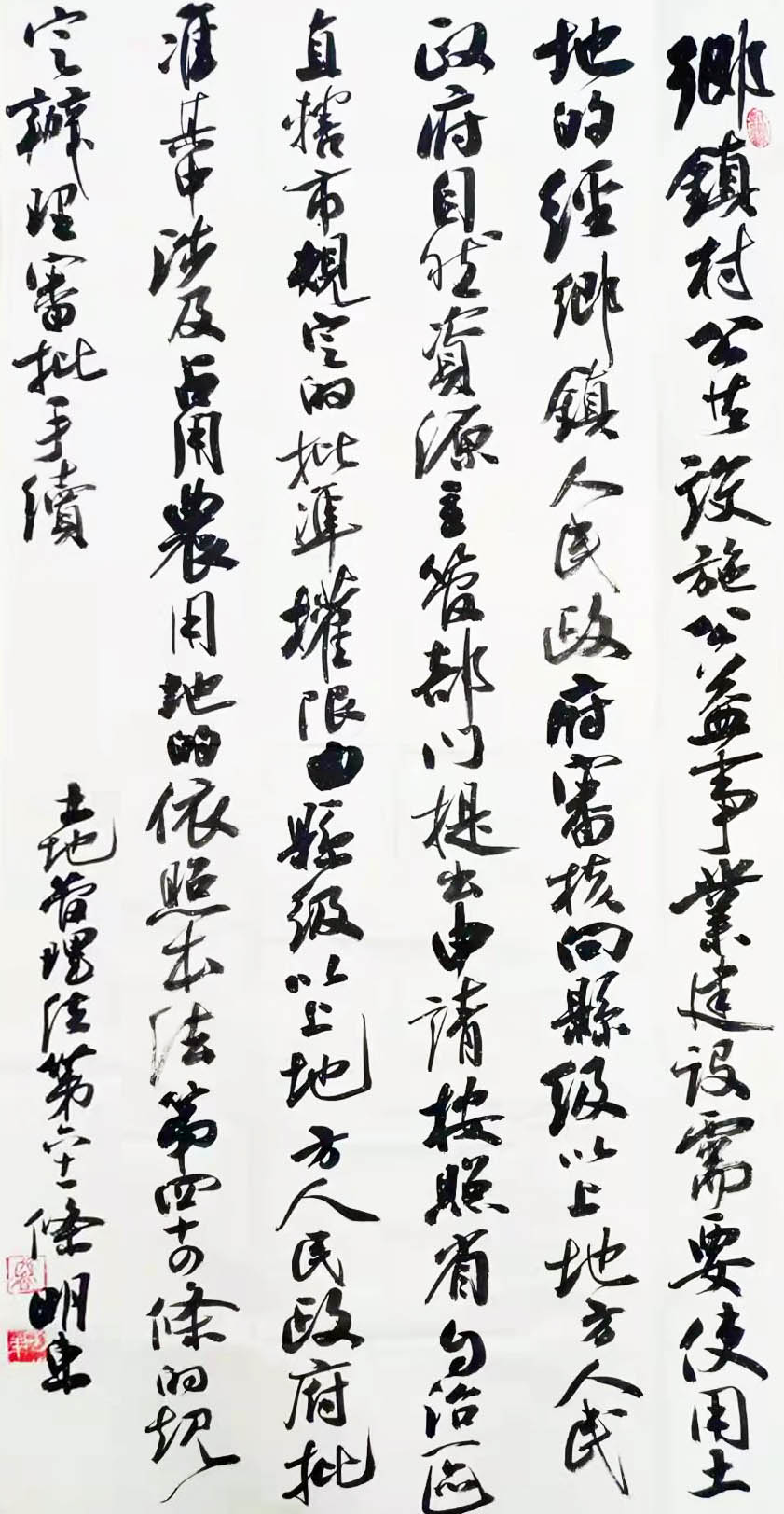 繼1600余位書法家參與書寫《中華人民共和國民法典》全部1260條法條之后,法治日報社聯(lián)合自然資源部法規(guī)司、自然資源部書畫研究會和北京昌平書法家協(xié)會,將筆端對準(zhǔn)土地管理“一法一條例”,即《中華人民共和國土地管理法》和《中華人民共和國土地管理法實施條例》。