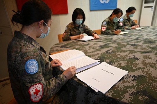 維和醫(yī)療分隊(duì)官兵學(xué)習(xí)法律法規(guī)和聯(lián)合國(guó)規(guī)范性文件。李曉龍 攝