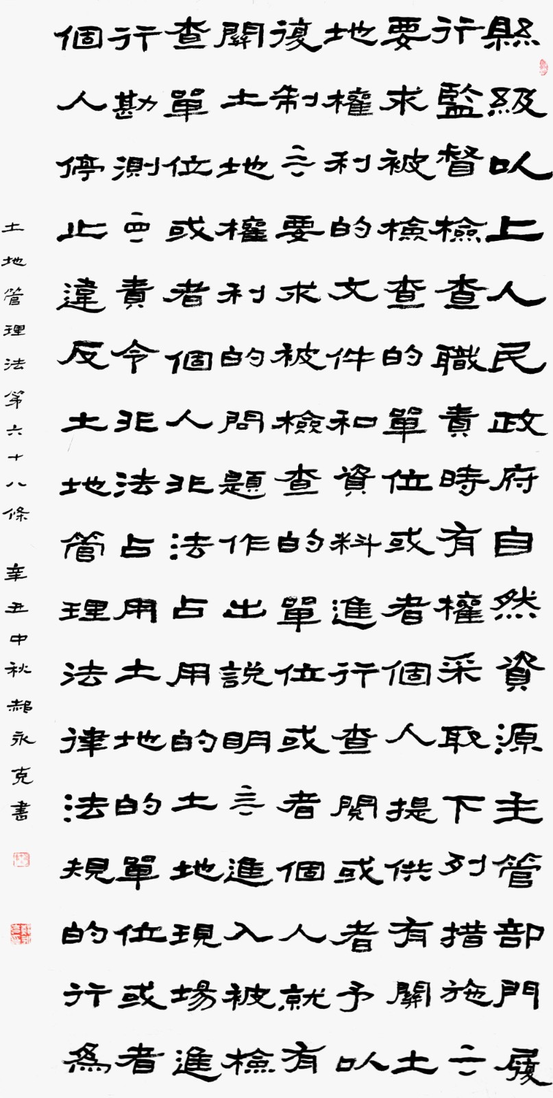 繼1600余位書法家參與書寫《中華人民共和國民法典》全部1260條法條之后,法治日報社聯(lián)合自然資源部法規(guī)司、自然資源部書畫研究會和北京昌平書法家協(xié)會,將筆端對準土地管理“一法一條例”,即《中華人民共和國土地管理法》和《中華人民共和國土地管理法實施條例》。