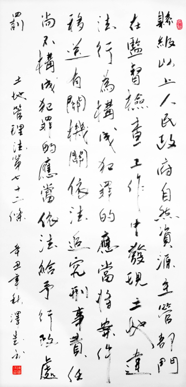 繼1600余位書法家參與書寫《中華人民共和國民法典》全部1260條法條之后,法治日報社聯(lián)合自然資源部法規(guī)司、自然資源部書畫研究會和北京昌平書法家協(xié)會,將筆端對準(zhǔn)土地管理“一法一條例”,即《中華人民共和國土地管理法》和《中華人民共和國土地管理法實施條例》。