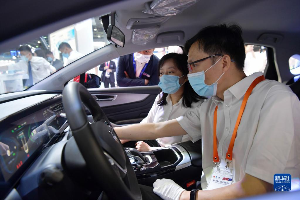 觀眾在第十二屆中國(guó)衛(wèi)星導(dǎo)航成就博覽會(huì)上參觀體驗(yàn)基于北斗衛(wèi)星導(dǎo)航系統(tǒng)應(yīng)用的電動(dòng)車(5月26日攝)。新華社記者 彭昭之 攝