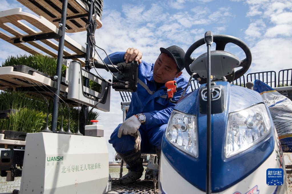 在北大荒集團(tuán)紅衛(wèi)農(nóng)場(chǎng)有限公司智慧農(nóng)業(yè)先行示范區(qū)內(nèi),工作人員設(shè)置無(wú)人駕駛插秧機(jī)工作路徑(5月11日攝)。據(jù)介紹,無(wú)人駕駛智能插秧機(jī)應(yīng)用北斗衛(wèi)星定位系統(tǒng),田間作業(yè)時(shí)可實(shí)現(xiàn)自動(dòng)避障、掉頭和轉(zhuǎn)彎。新華社記者 張濤 攝