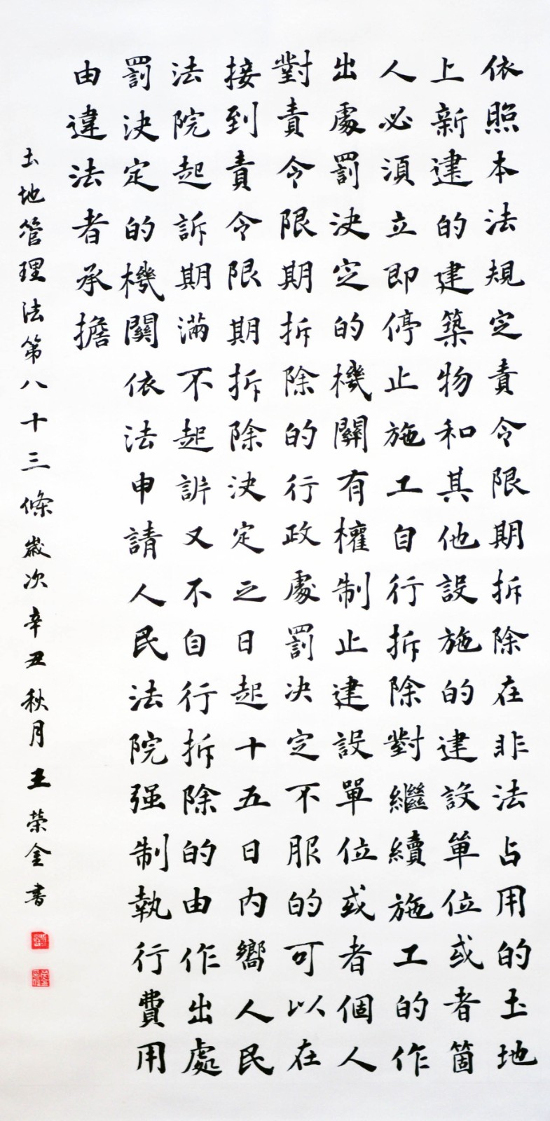 繼1600余位書法家參與書寫《中華人民共和國民法典》全部1260條法條之后,法治日報社聯(lián)合自然資源部法規(guī)司、自然資源部書畫研究會和北京昌平書法家協(xié)會,將筆端對準土地管理“一法一條例”,即《中華人民共和國土地管理法》和《中華人民共和國土地管理法實施條例》。