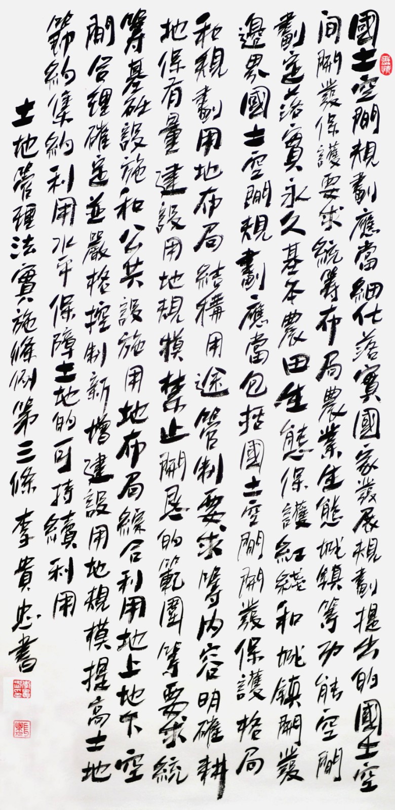 繼1600余位書法家參與書寫《中華人民共和國(guó)民法典》全部1260條法條之后,法治日?qǐng)?bào)社聯(lián)合自然資源部法規(guī)司、自然資源部書畫研究會(huì)和北京昌平書法家協(xié)會(huì),將筆端對(duì)準(zhǔn)土地管理“一法一條例”,即《中華人民共和國(guó)土地管理法》和《中華人民共和國(guó)土地管理法實(shí)施條例》。