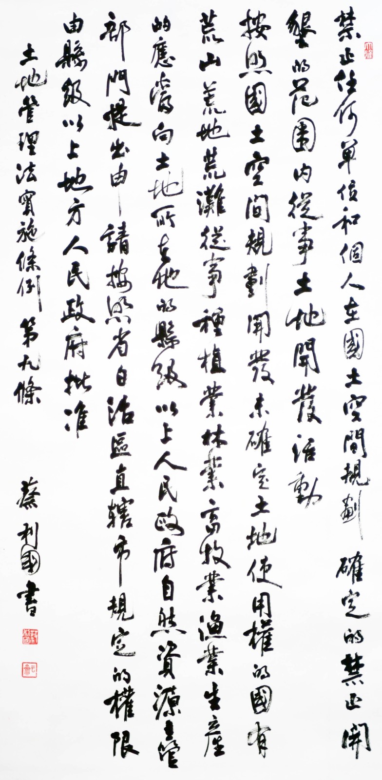 繼1600余位書法家參與書寫《中華人民共和國民法典》全部1260條法條之后,法治日報社聯合自然資源部法規(guī)司、自然資源部書畫研究會和北京昌平書法家協會,將筆端對準土地管理“一法一條例”,即《中華人民共和國土地管理法》和《中華人民共和國土地管理法實施條例》。