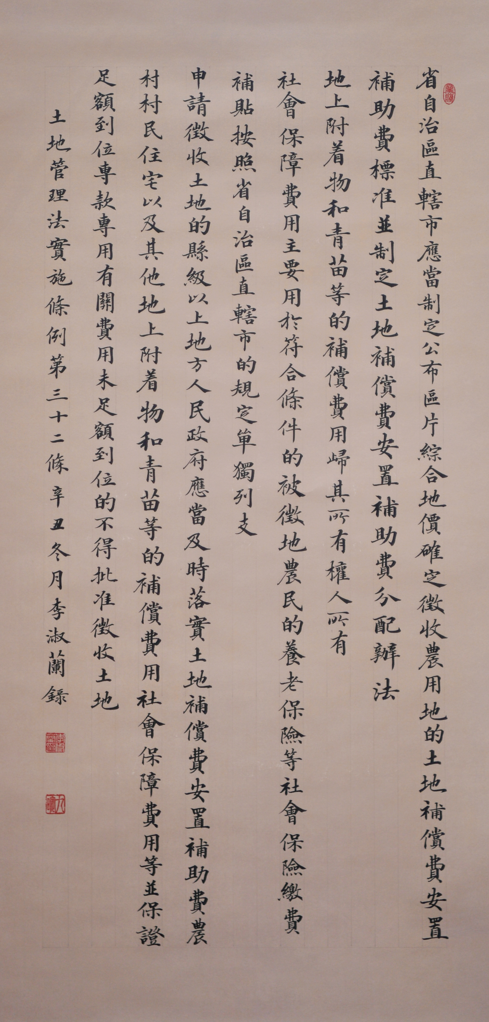 繼1600余位書法家參與書寫《中華人民共和國民法典》全部1260條法條之后,法治日報(bào)社聯(lián)合自然資源部法規(guī)司、自然資源部書畫研究會和北京昌平書法家協(xié)會,將筆端對準(zhǔn)土地管理“一法一條例”,即《中華人民共和國土地管理法》和《中華人民共和國土地管理法實(shí)施條例》。