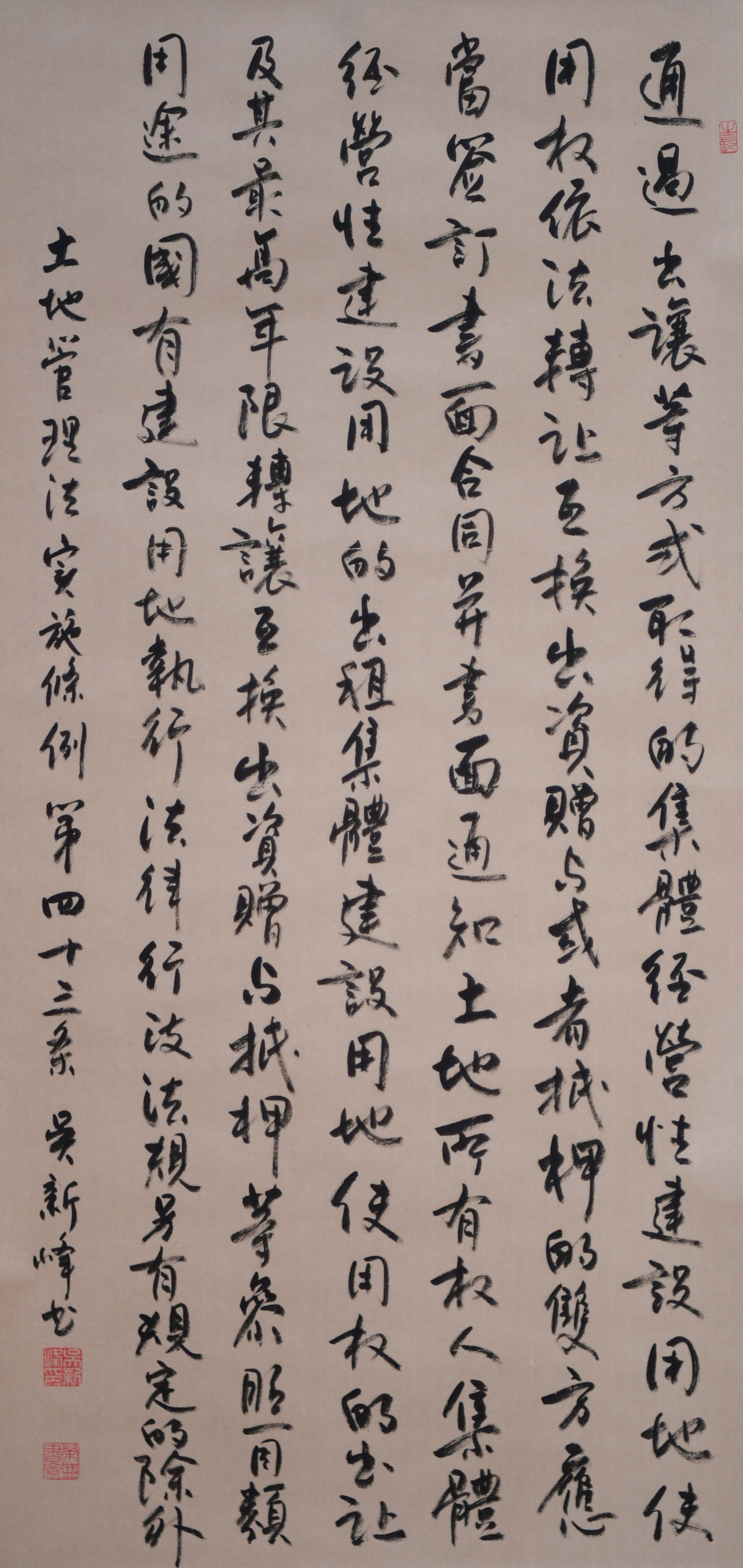繼1600余位書法家參與書寫《中華人民共和國民法典》全部1260條法條之后,法治日報社聯(lián)合自然資源部法規(guī)司、自然資源部書畫研究會和北京昌平書法家協(xié)會,將筆端對準土地管理“一法一條例”,即《中華人民共和國土地管理法》和《中華人民共和國土地管理法實施條例》。