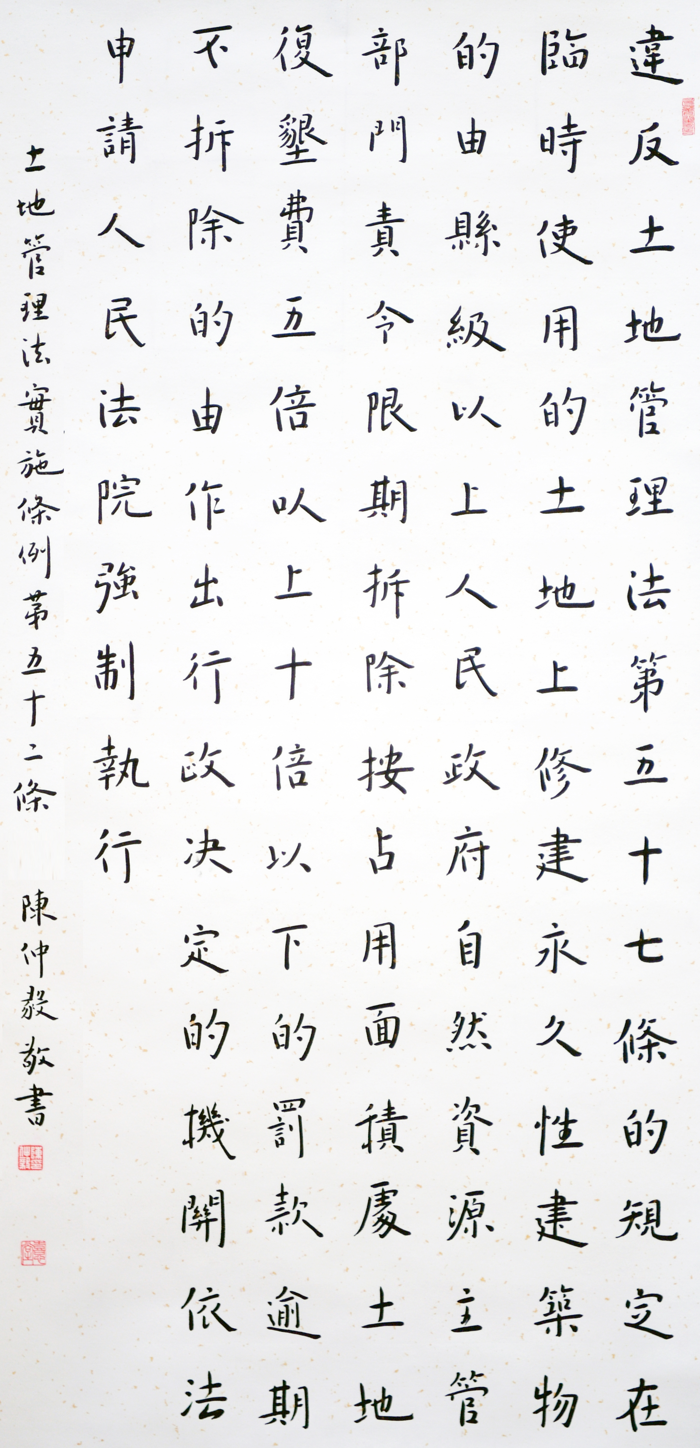 繼1600余位書法家參與書寫《中華人民共和國民法典》全部1260條法條之后,法治日?qǐng)?bào)社聯(lián)合自然資源部法規(guī)司、自然資源部書畫研究會(huì)和北京昌平書法家協(xié)會(huì),將筆端對(duì)準(zhǔn)土地管理“一法一條例”,即《中華人民共和國土地管理法》和《中華人民共和國土地管理法實(shí)施條例》。