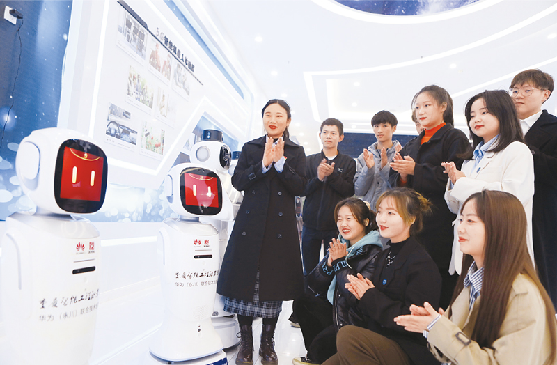 2021年11月13日,重慶智能工程職業(yè)學院校園內,智能機器人“大華”、“大智”向學生們普及黨的十九屆六中全會精神,其可愛的形象和聲音,深受學生們的喜愛。 人民圖片 陳仕川/攝