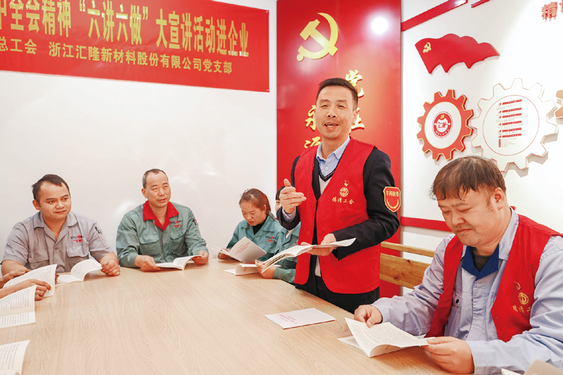 浙江省湖州市德清縣總工會組織由車間政委、勞動模范、浙江工匠等組成的“典型模范宣講團”走進企業(yè)宣講黨的十九屆六中全會精神。圖為2021年11月30日,宣講團成員在浙江匯隆新材料股份有限公司的紅色車間為職工宣講全會精神。 人民圖片 姚海翔/攝