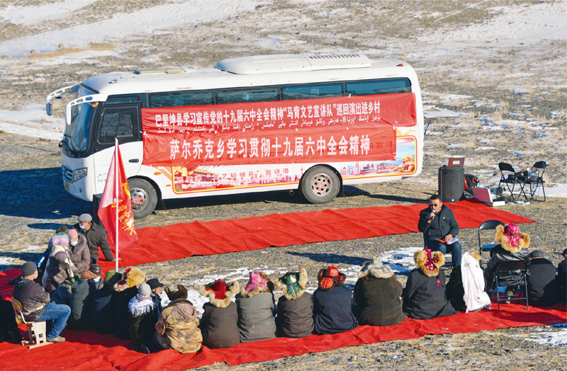 新疆巴里坤哈薩克自治縣組建“馬背文藝宣講隊”,深入邊遠農牧區(qū)鄉(xiāng)村開展黨的十九屆六中全會精神巡回宣講。圖為2021年12月1日,宣講隊給冬牧場的哈薩克族牧民宣講全會精神。 人民圖片 張建剛/攝