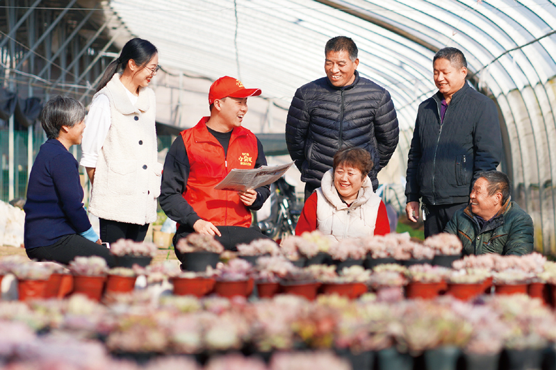 河北省邢臺市內丘縣組織六十二支“小馬扎”宣講小分隊深入到社區(qū)、學校、農村和企業(yè),利用快板、詩歌、說唱等群眾喜聞樂見的形式開展宣講活動,把黨的十九屆六中全會精神送到群眾家門口。圖為2021年11月23日,“小馬扎”宣講小分隊隊員在馬澗村花卉大棚宣講全會精神。 人民圖片 劉繼東/攝