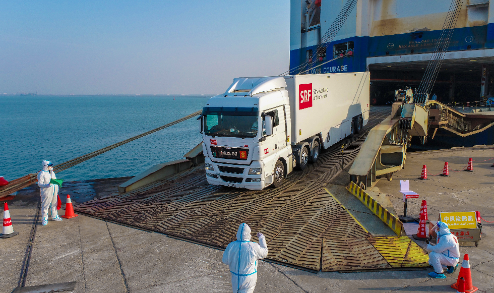 1月15日上午,載運著6輛北京冬奧會轉(zhuǎn)播車的韓國籍“現(xiàn)代英勇”輪靠泊天津港。本票冬奧物資由天津出入境邊防檢查總站東港邊檢站完成快速入境查驗后,將直接運送至北京冬奧場館。