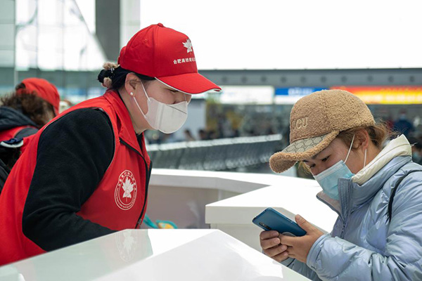 2022年1月20日,身穿“紅馬甲”的志愿者魯云正在服務(wù)旅客。(圖片由受訪者提供)