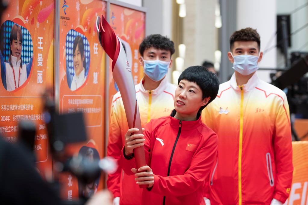 1月5日,冬奧會短道速滑冠軍張會(中)在北京2022年冬奧會火炬展示活動現(xiàn)場手持火炬進(jìn)行展示。新華社記者 張濤 攝