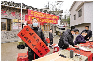 當(dāng)天下午,記者跟隨蘭俊來到平定營社區(qū)高枧坡村民組。在該村葆初廣場的墻面上,寫著“永遠(yuǎn)跟黨走”“八要八不要”村規(guī)民約以及一些移風(fēng)易俗的宣傳標(biāo)語。廣場上,愛好書法的蘭俊邀請(qǐng)書法朋友圈人士在這里義務(wù)為村民寫春聯(lián),給村民送去新春祝福。