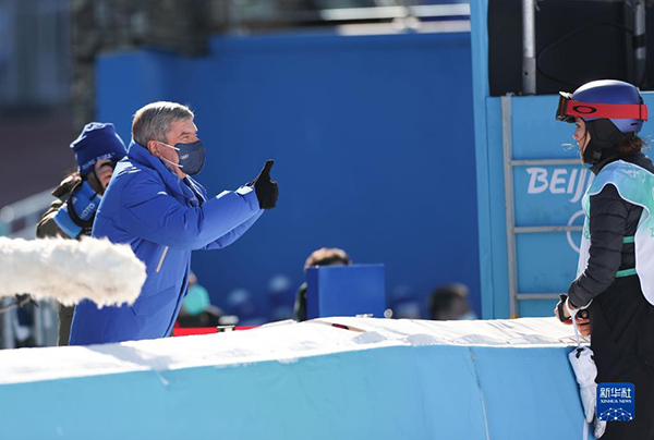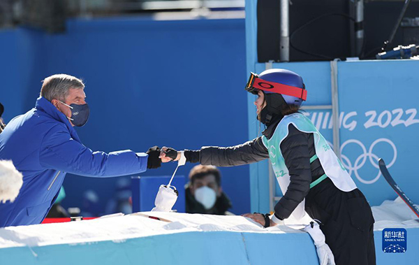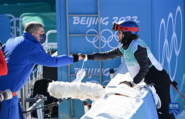 2月8日,國際奧委會主席巴赫(左)向中國選手谷愛凌表達(dá)祝賀。