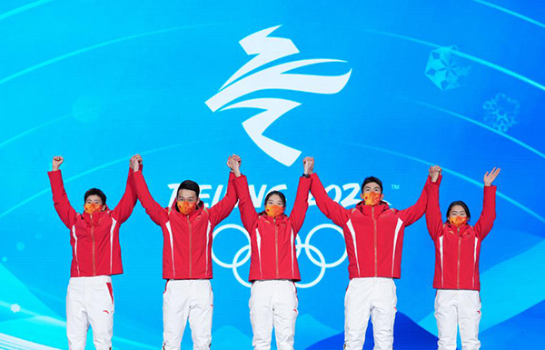 2月6日,中國隊選手范可新、任子威、曲春雨、武大靖、張雨婷(從左至右)在北京2022年冬奧會短道速滑混合團體接力獎牌頒發(fā)儀式上。新華社記者鞠煥宗攝
