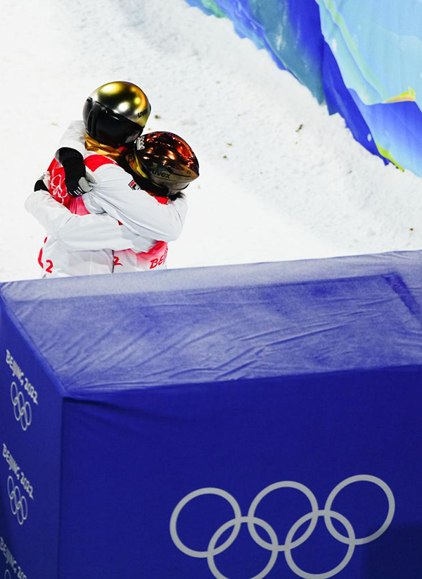 2月10日,中國隊選手徐夢桃(右)和賈宗洋在北京2022年冬奧會自由式滑雪空中技巧混合團(tuán)體決賽比賽后擁抱。新華社記者許暢攝