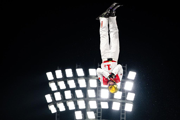 2月10日,中國隊選手賈宗洋在北京冬奧會自由式滑雪空中技巧混合團(tuán)體決賽比賽中。新華社記者肖藝九攝