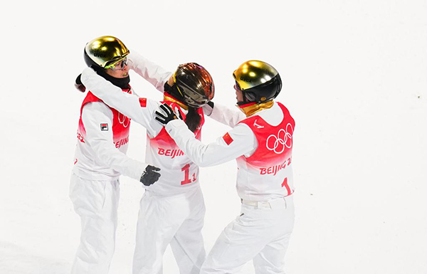 2月10日,中國隊選手徐夢桃(中)與隊友齊廣璞(左)、賈宗洋在北京冬奧會自由式滑雪空中技巧混合團(tuán)體決賽后。新華社記者許暢攝