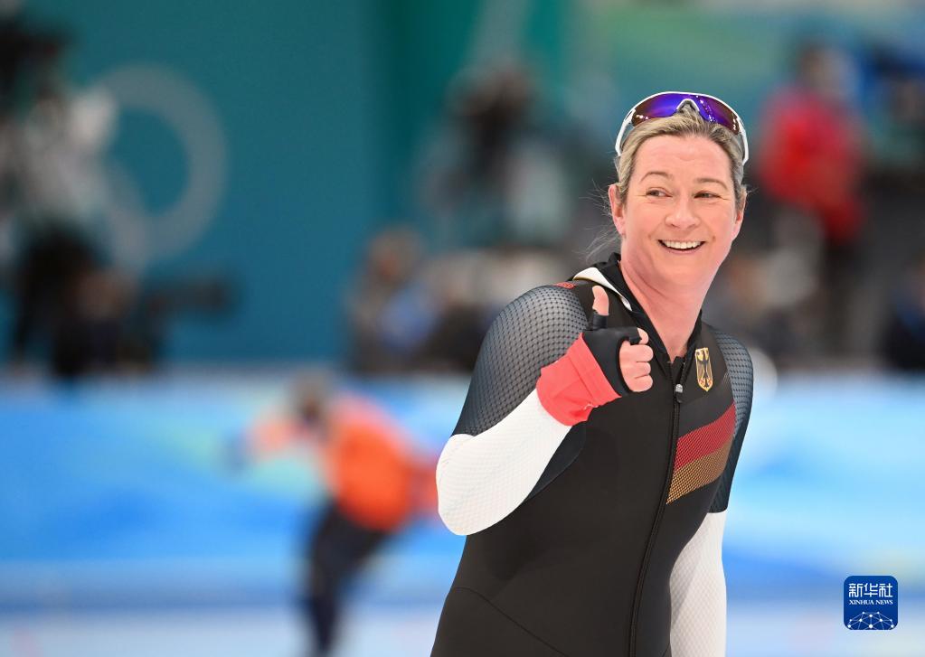 2月5日,德國(guó)選手克勞迪婭·佩希施泰因在速度滑冰女子3000米決賽后。新華社記者 武巍 攝