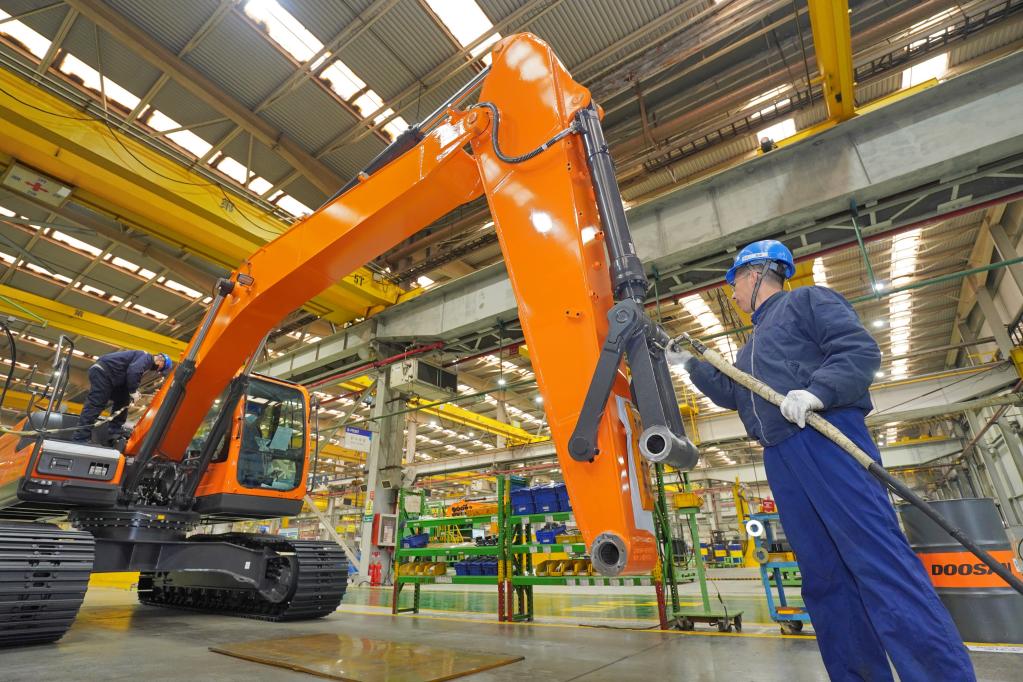 2月7日,在山東煙臺(tái)一家工程機(jī)械生產(chǎn)企業(yè),工人在生產(chǎn)車間內(nèi)忙碌。新華社發(fā)(唐克攝)