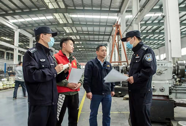 浙江省武義縣公安局熟溪派出所組建“紅風(fēng)箏”助企服務(wù)驛站,切實為轄區(qū)企業(yè)做好外來人口服務(wù)管理工作,及時排查化解企業(yè)員工間的矛盾糾紛,組織平安志愿者開展護企巡邏,為企業(yè)發(fā)展提供良好治安環(huán)境。圖為民警走訪企業(yè)了解治安情況。 徐文榮 攝