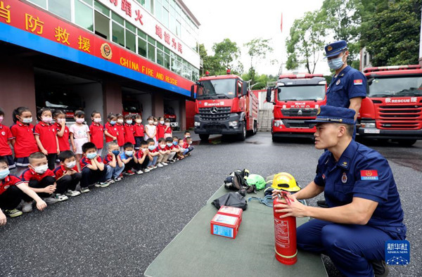 5月30日,在湖南省資興市消防救援大隊,消防員為小朋友們講解滅火器的使用方法。