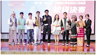 圖為今年5月31日,鄧鵬飛(左5)帶領(lǐng)同學(xué)們參加第十屆“挑戰(zhàn)杯”云南省大學(xué)生創(chuàng)業(yè)計(jì)劃競賽。受訪者供圖