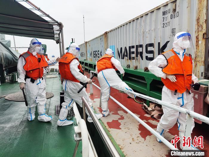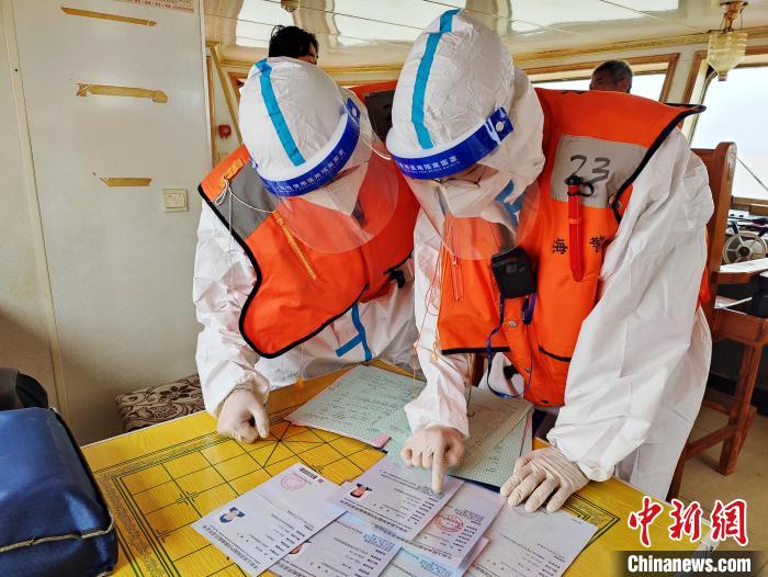 上海海警局登船進行檢查。 李丹 攝