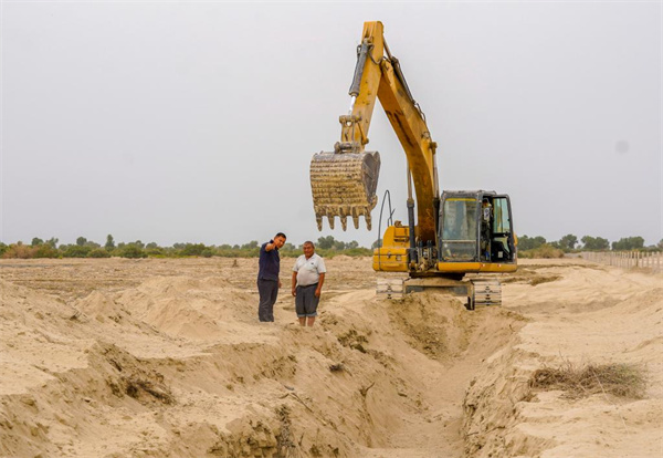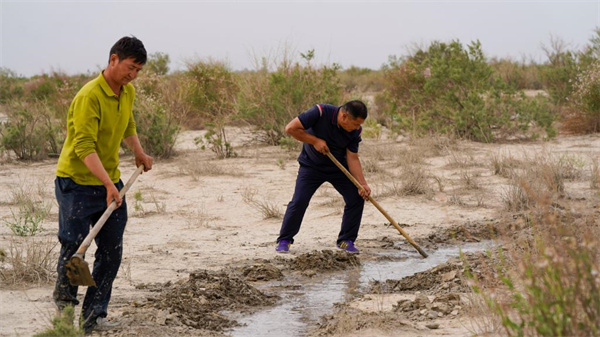 6月20日,艾力·尼亞孜(右)和護(hù)林員們一起挖渠引水。