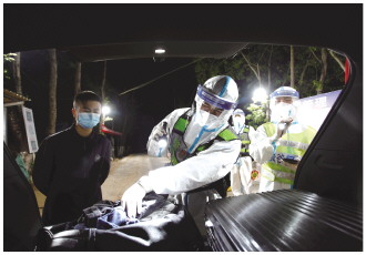 4月9日,執(zhí)勤民警在燈根檢查點(diǎn)檢查過往車輛。