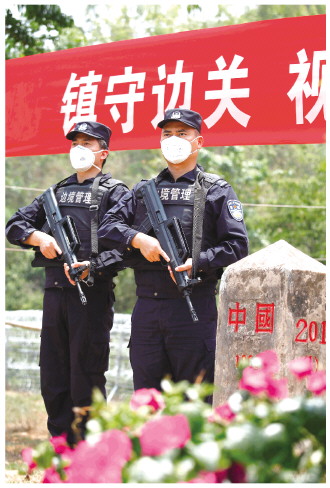 4月27日,芒信邊境派出所執(zhí)勤民警在界樁旁站崗。