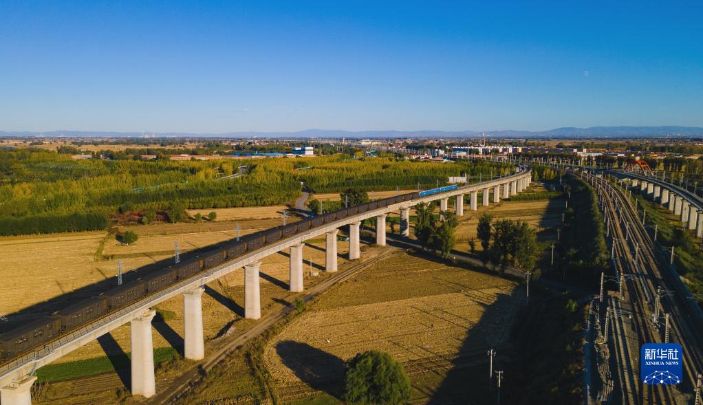 這是在內(nèi)蒙古呼和浩特拍攝的運(yùn)煤專列(2021年10月15日攝,無(wú)人機(jī)照片)。新華社發(fā)(夏亮 攝)