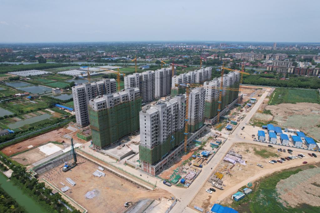 湖南省沅江市的漁民新村,10棟17層電梯房已經封頂,正在建設的6棟大樓周邊,塔吊林立,工程車輛往返,工人們正熱火朝天地干著活兒。