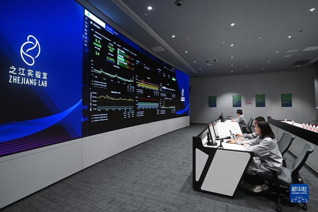 在之江實(shí)驗(yàn)室計(jì)算與數(shù)據(jù)中心,工程師們通過“之江云”系統(tǒng)監(jiān)測服務(wù)器集群的運(yùn)行狀態(tài)(2022年6月23日攝)。新華社記者 黃宗治 攝