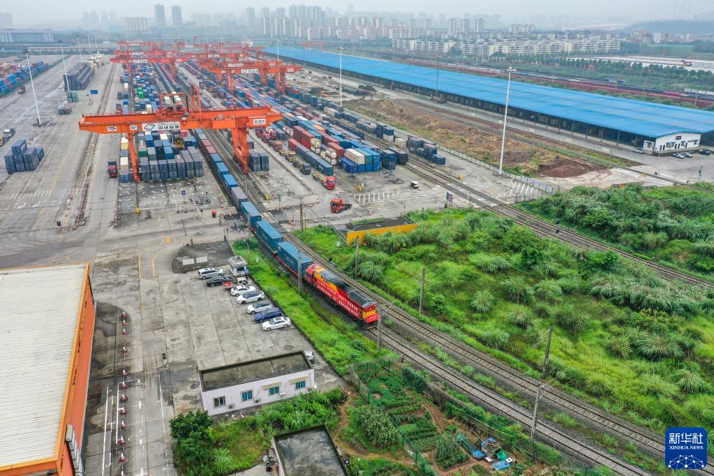 滿載著電子產(chǎn)品、機(jī)械零件、日用百貨等貨物的中歐班列(重慶)第10000列列車(chē)從重慶團(tuán)結(jié)村中心站駛出(2022年6月23日攝,無(wú)人機(jī)照片)。新華社記者 黃偉 攝
