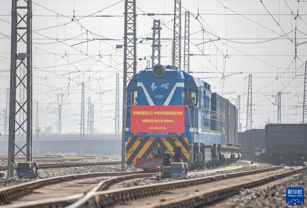 陸海新通道長(zhǎng)江-中南半島國(guó)際聯(lián)運(yùn)班列(中國(guó)果園港-老撾萬(wàn)象-緬甸仰光)從重慶果園港發(fā)出(2022年4月7日攝)。新華社記者 黃偉 攝