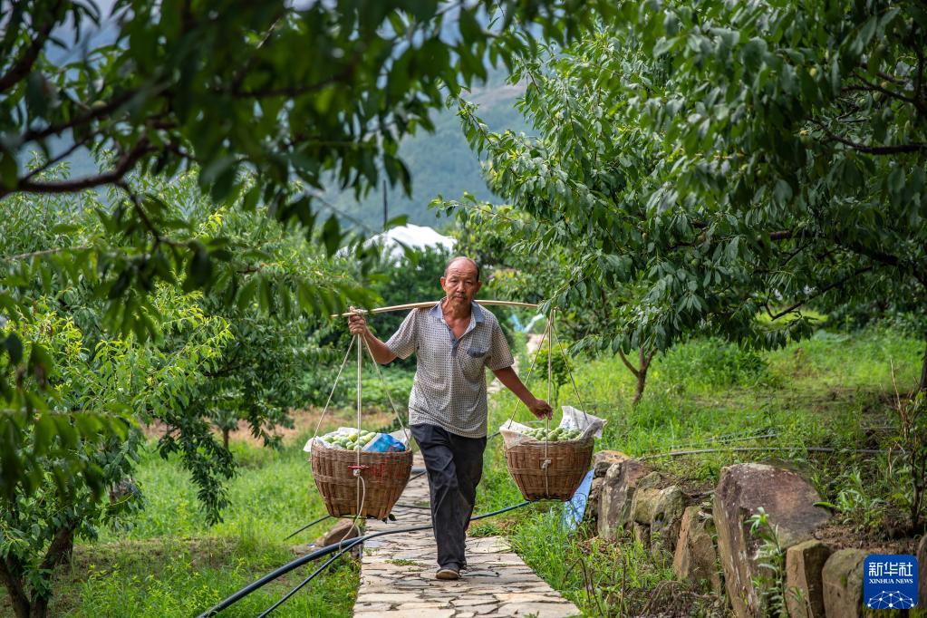 在巫山縣曲尺鄉(xiāng)柑園村,村民張興前在挑運(yùn)脆李(2022年7月2日攝)。新華社記者 黃偉 攝